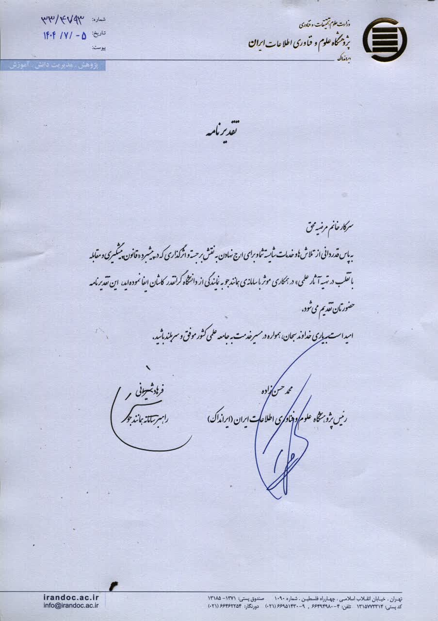 طی مراسمی از نمایندگان برتر موسسه های آموزشی و پژوهشی در سامانه همانندجو در محل پژوهشگاه علوم و فناوری اطلاعات ایران( ایرانداک) تقدیر شد.