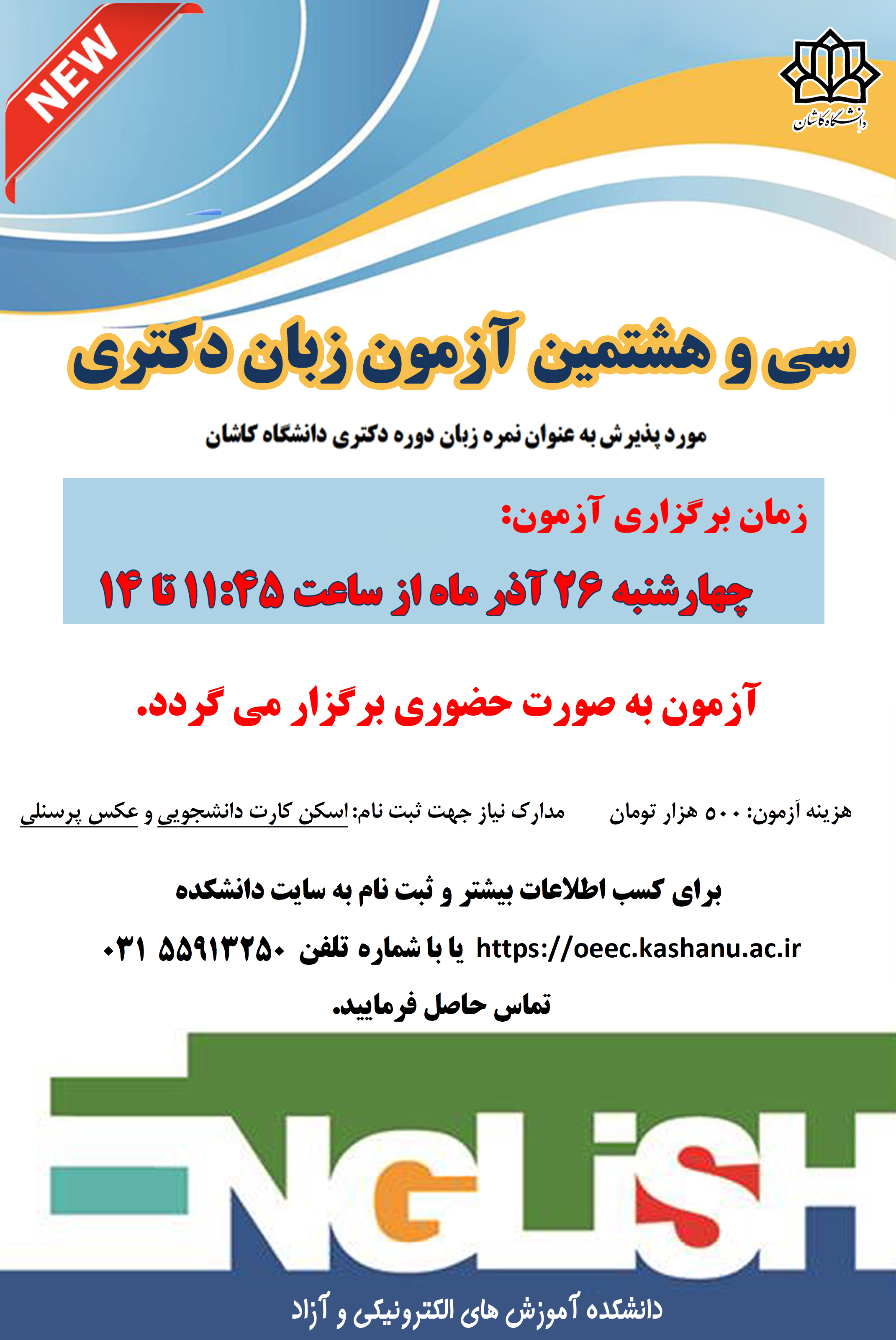 زمان آزمون زبان دکتری: چهارشنبه 26 آذر ماه 1404 ساعت 11:45 تا 14 به صورت حضوری